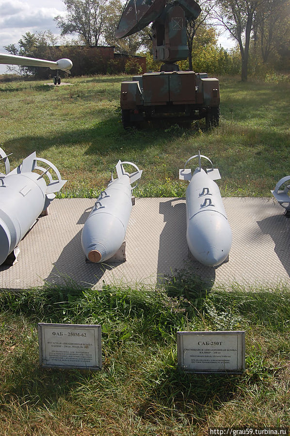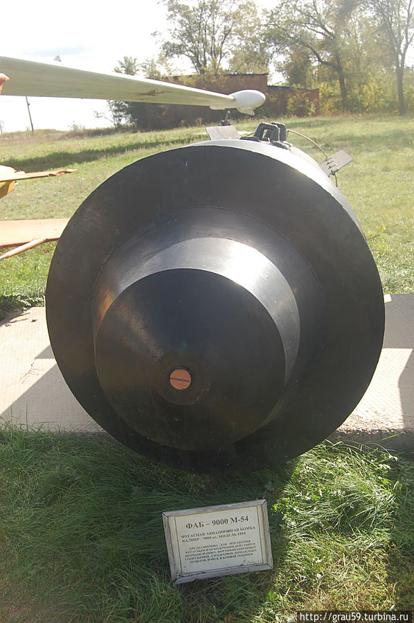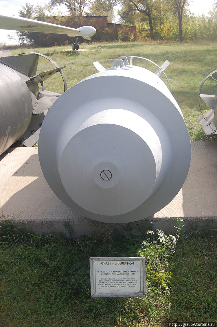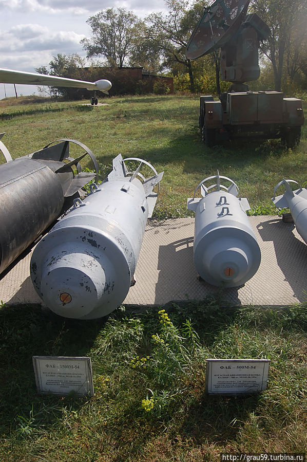 Фугасная авиационная бомба ФАБ-1500М-54. Калибр — 1500 кг. Модификация 1954года.(На фото слева). Предназначена для поражения защищенных фортификационных объектов, мостов, плотин и боевой техники.Фугасная авиационная бомба ФАБ-500М-54. Калибр — 500 кг. Модификация 1954года.(На фото справа). Предназначена для поражения защищенных фортификационных объектов, мостов, командных пунктов ,войск и боевой техники противника.