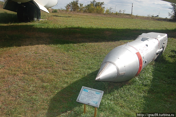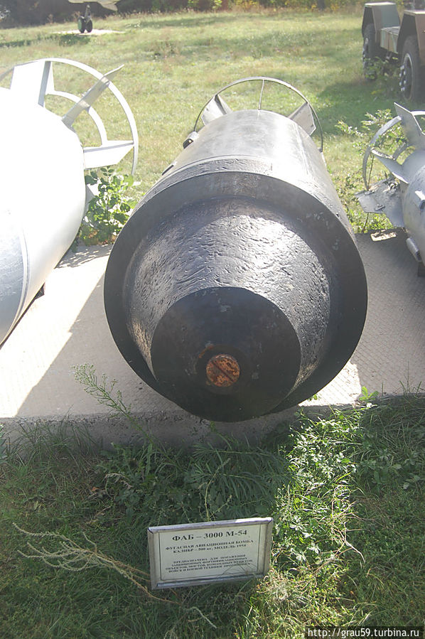 Фугасная авиационная бомба ФАБ-3000М-54. Калибр — 3000 кг. Модификация 1954года.(На фото слева). Предназначена для поражения защищенных фортификационных объектов, мостов, командных пунктов ,войск и боевой техники противника.