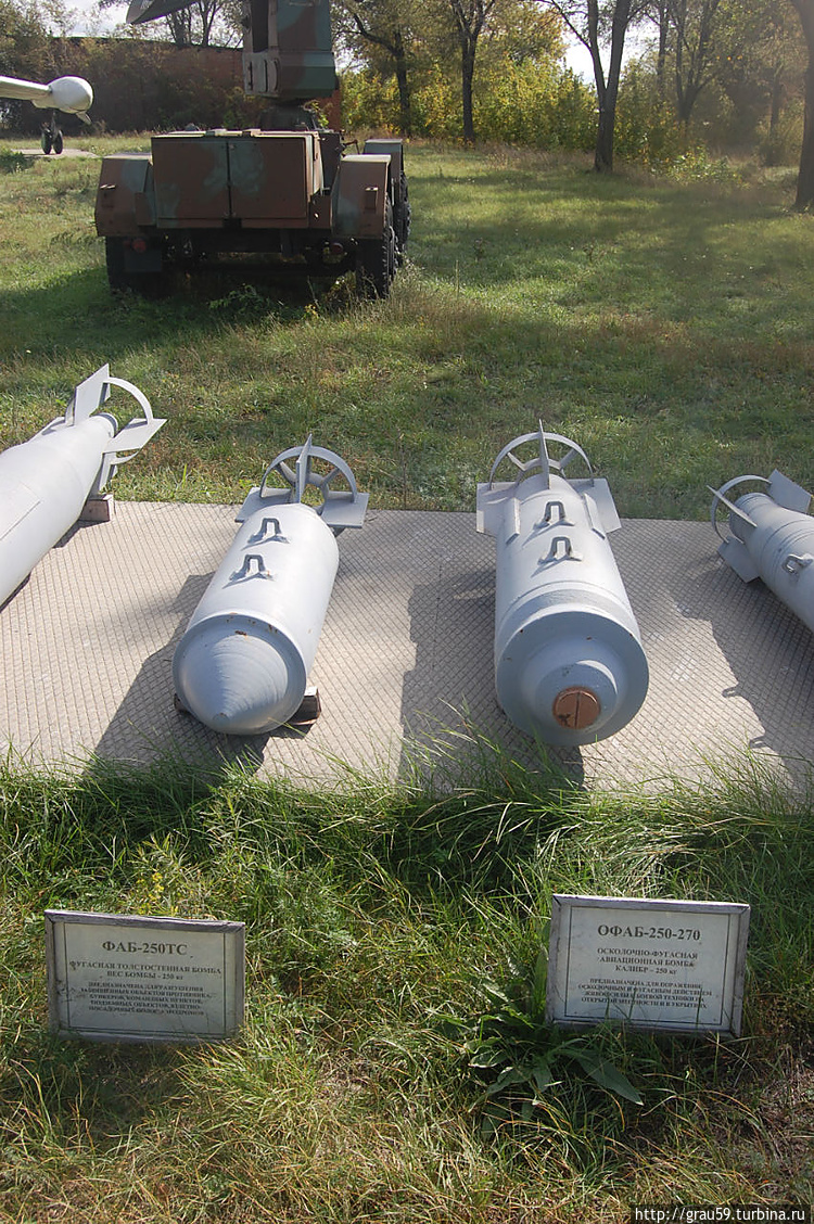 Фугасная толстостенная бомба ФАБ-250ТС. Вес бомбы — 250кг. (На фото слева). Предназначена для разрушения защищенных объектов противника, бункеров, командных пунктов, подземных объектов, взлётно-посадочных полос аэродромов. Осколочно-фугасная авиационная бомба ОФАБ-250-270. Калибр-250 кг. ( На фото справа) Предназначена для поражения осколочным и фугасным действием живой силы и боевой техники на открытой местности и в укрытиях.