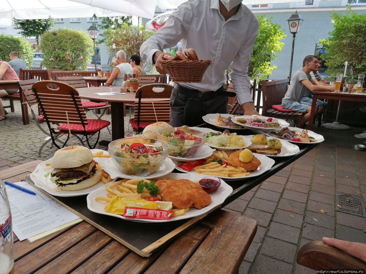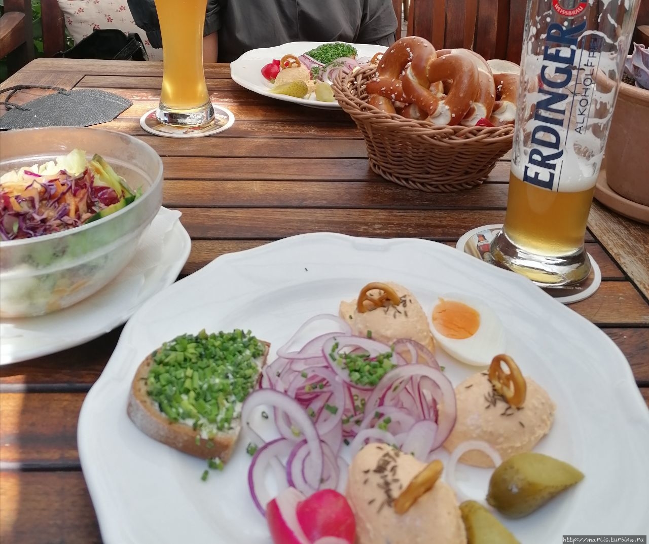 В ресторане можно попробовать все регулярные сорта, но самое интересное на мой взгляд — это сезонное пиво, которое выпускают малыми тиражами или литражами.)) Цена поллитрового бокала пива любого сорта — 4Е. Закуска имеется как типично баварская, так и фастфуд.
