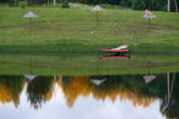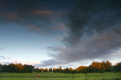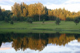 Прибыли уже на закате и потом долго не могли оторваться от поверхности небольшого озерца, на берегу которого раскинулось это место. Июньские закаты очень долгие, сидишь, глядя на слегка колышущуюся воду с постоянно меняющими цвет отражениями, а то и качаешься на огромных установленных на бережку качелях, и кажется, что уже не осталось ничего позади, и нет ничего впереди, а что есть — так это только глубина этих самых озерных отражений. Даже комаров там не было, и никто не досаждал. А июньские вечера очень теплые как известно.