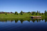 Прибыли уже на закате и потом долго не могли оторваться от поверхности небольшого озерца, на берегу которого раскинулось это место. Июньские закаты очень долгие, сидишь, глядя на слегка колышущуюся воду с постоянно меняющими цвет отражениями, а то и качаешься на огромных установленных на бережку качелях, и кажется, что уже не осталось ничего позади, и нет ничего впереди, а что есть — так это только глубина этих самых озерных отражений. Даже комаров там не было, и никто не досаждал. А июньские вечера очень теплые как известно.