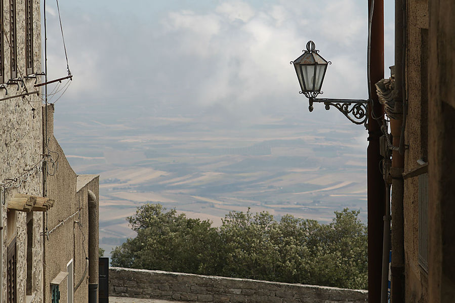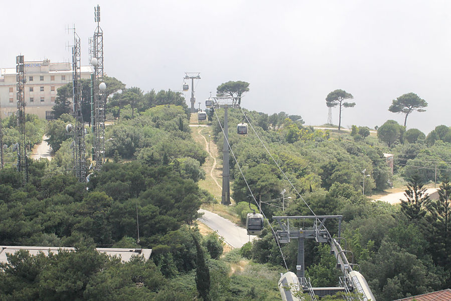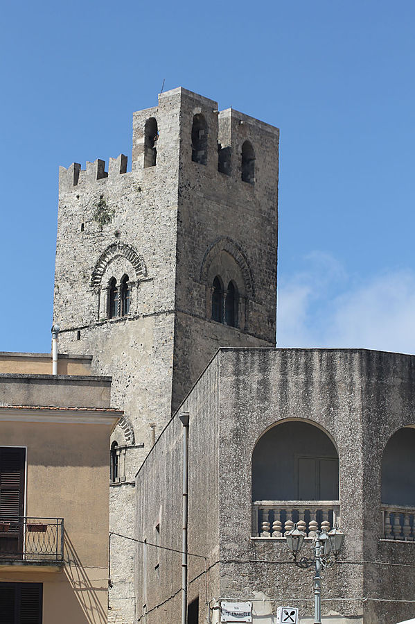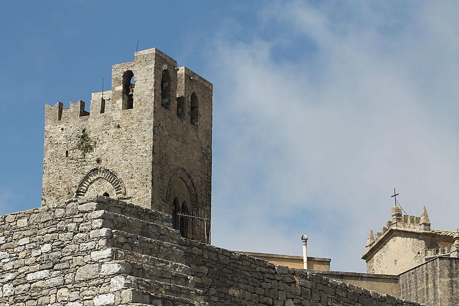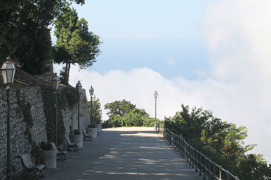 Эриче — маленький городок — музей на западе Сицилии. Ведут туда две дороги — одна со стороны Вердериче, другая со стороны Трапани. Есть еще фуникулер, на мой взгляд, вариант наиболее оптимальный, чтобы оказаться на вершине горы. Поднимались мы на машине со стороны Вердериче по очень-очень крутой и серпантинистой дороге. А если учесть, что мой сын сел впервые за руль машины, арендованной на Крите, в прошлом году, а второй раз, арендованной на Сицилии, и другого опыта вождения у него не было, то состояние ужаса и паники, в котором я находилась, прощаю себе. Спускались по более пологой дороге в Трапани.