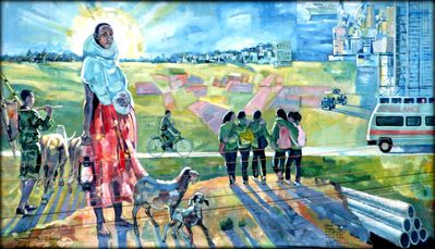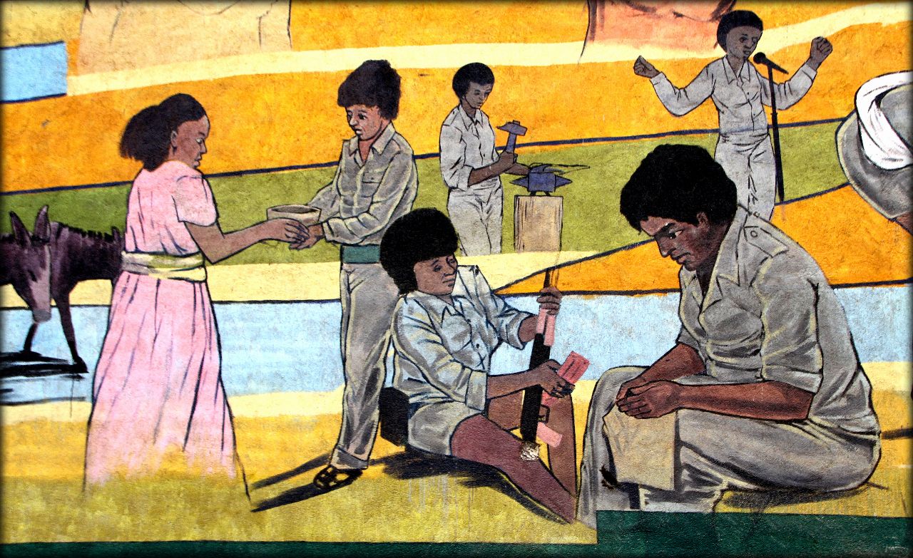 Наглядно разобраться в этом и прочувствовать мне помогло прекрасное граффити (созданное в 2013 году), которое мы встретили по дороге. Я сразу же попросил водителя остановиться и снял все фрагменты художественного полотна, посвященного борьбе за независимость и сегодняшней мирной жизни Эритреи.