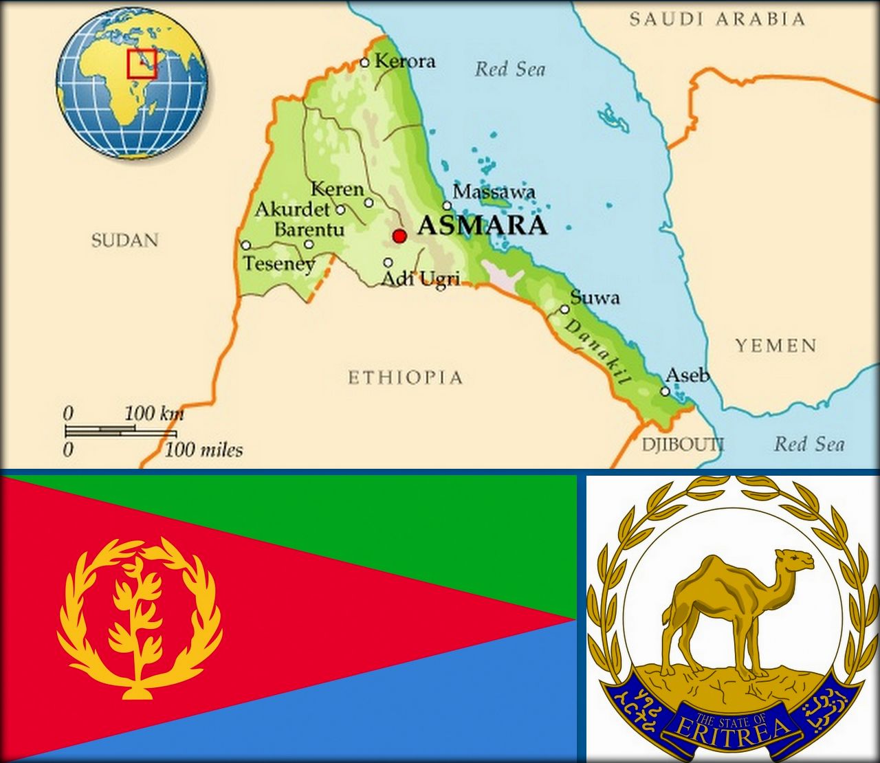 Утверждён в день получения страной независимости от Эфиопии — 24 мая 1993 года. Верблюд был выбран в качестве государственного символа в знак того, что эти животные сыграли важную роль в транспортной системе во время войны за независимость. Ниже надпись "Государство Эритрея" на трёх официальных языках: английском, арабском и тигринья.