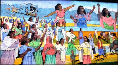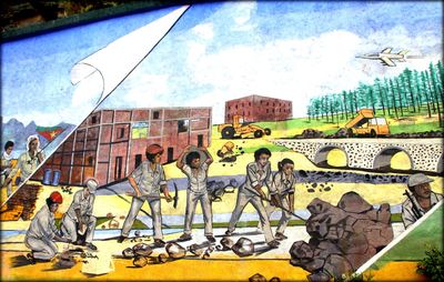 До сих пор в городах и столице висят патриотичные банеры посвящённые независимости Эритреи, на которых изображён ликующий народ и президент. Этот я сфотографировал в Асмэре.