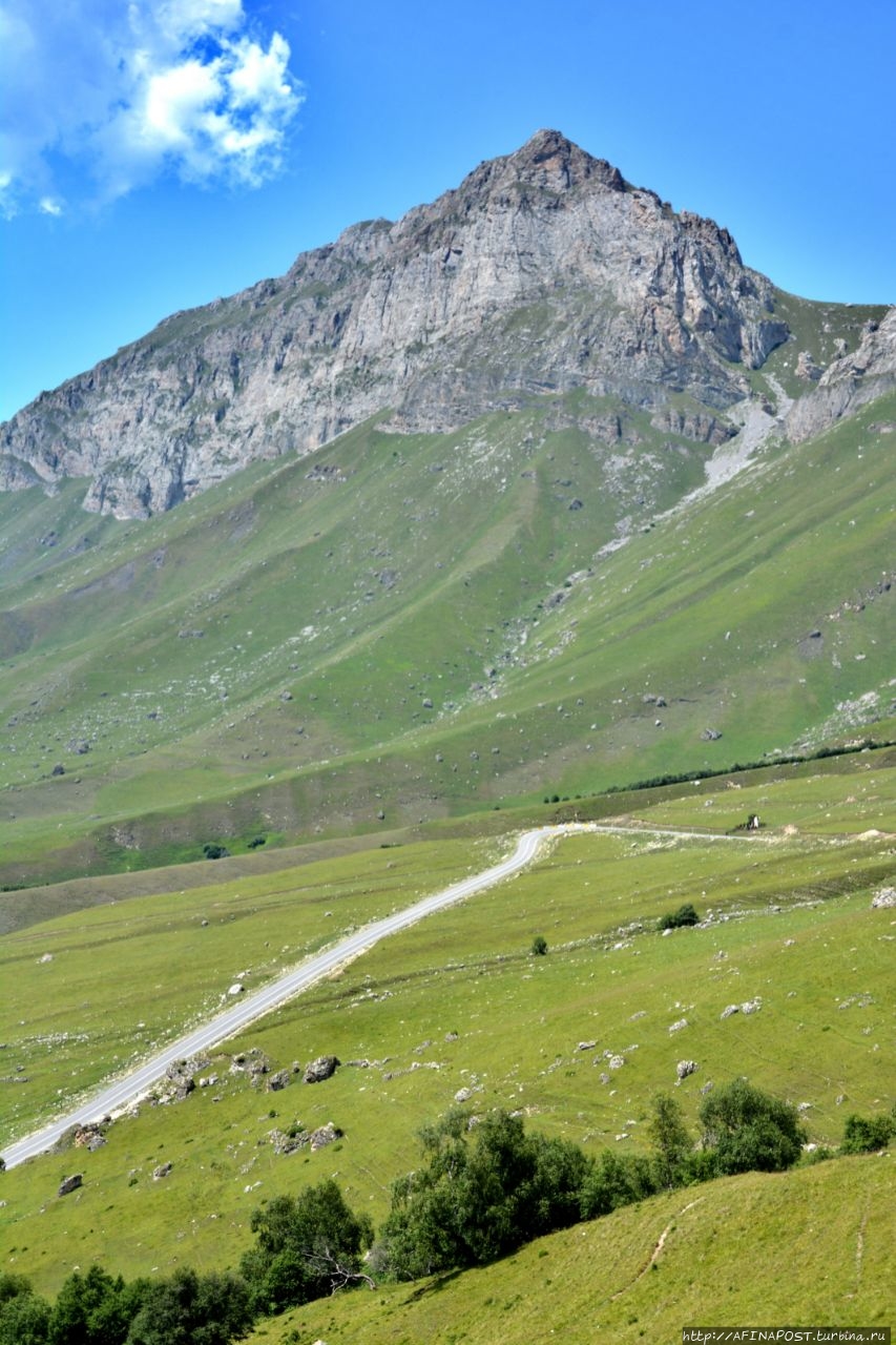 Из следов человека — только редкие вышки электропередач на склонах, да дорога вьётся серпантином и теряется где-то в горах.