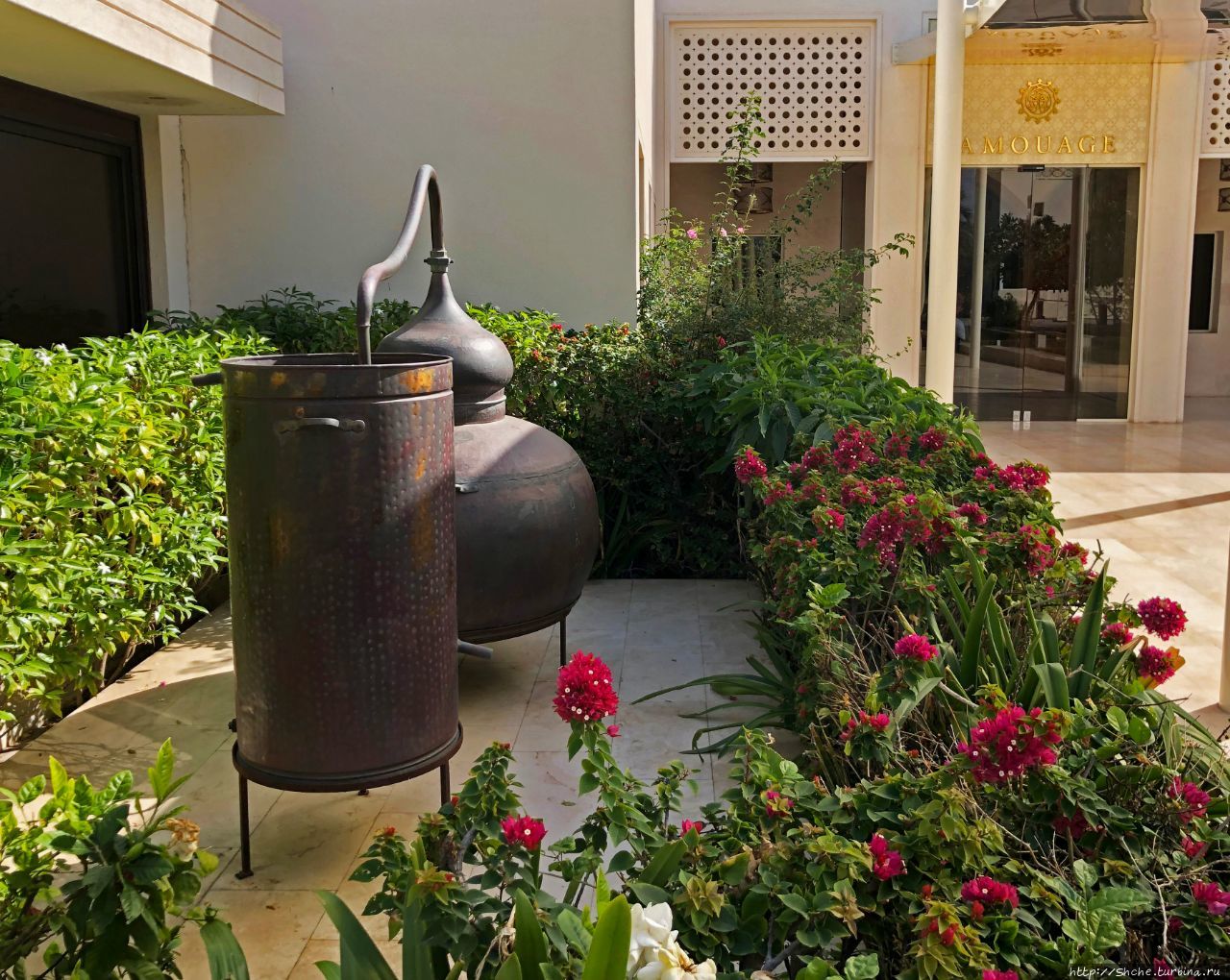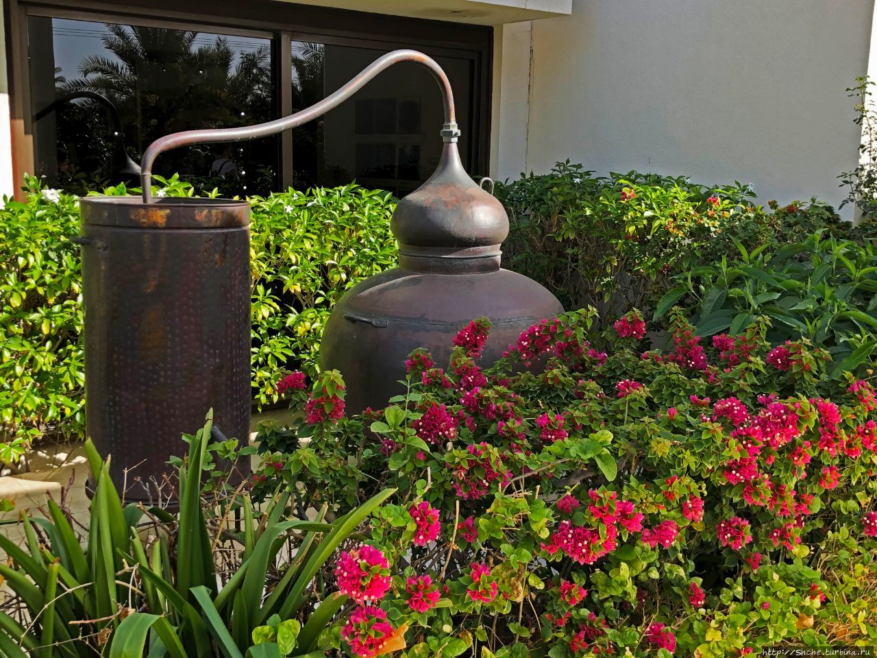 В саду выставлены образцы старых перегонных аппаратов, при помощи которых в Омане традиционно получали эфирные масла самый разнообразных цветов и растений.