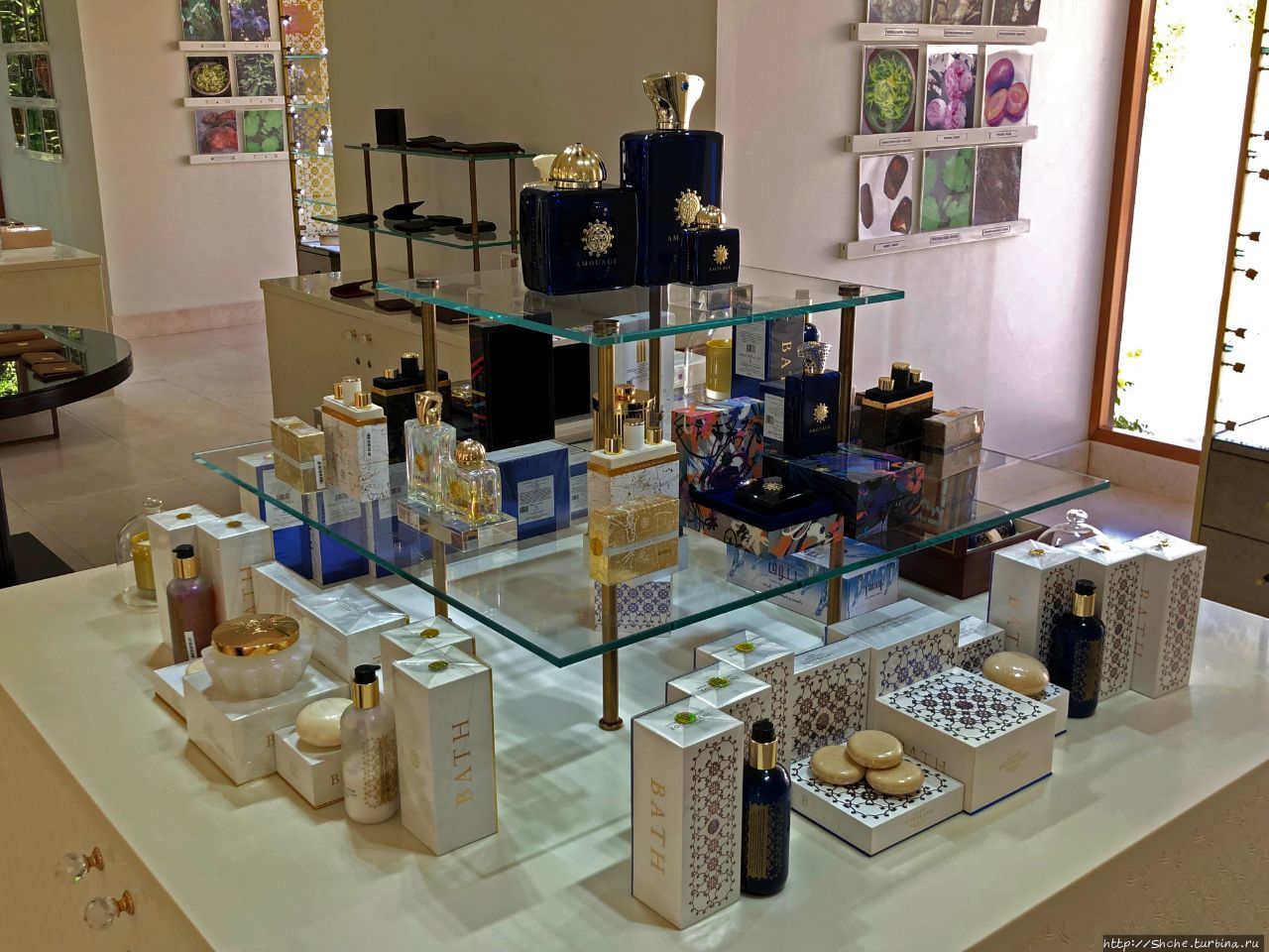 На стенах есть фото цветов и растений, которые используются для поучения запахов...