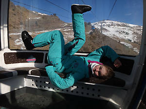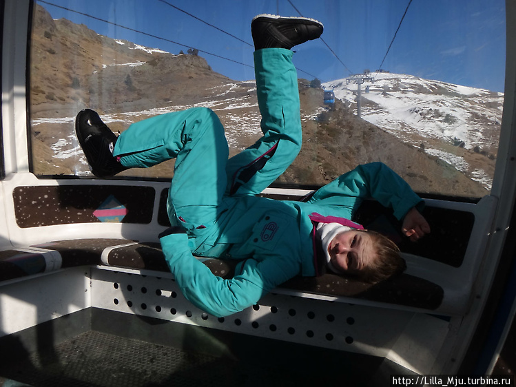 Погода отличная, небо чистое, солнце выжигает мне глаза. Первые минут 15 я практически рыдаю и хожу на ощупь, далее кое-как привыкаю. Но надолго меня не хватает, поэтому, не дожидаясь 16 часового автобуса, уезжаем в пустой кабине фуникулёра, что даёт возможность немного подурачиться, т.к. обычно в кабину набивается около 10-15 человек. Вечером этого же дня отправлляемся в магазин спорттоваров