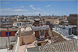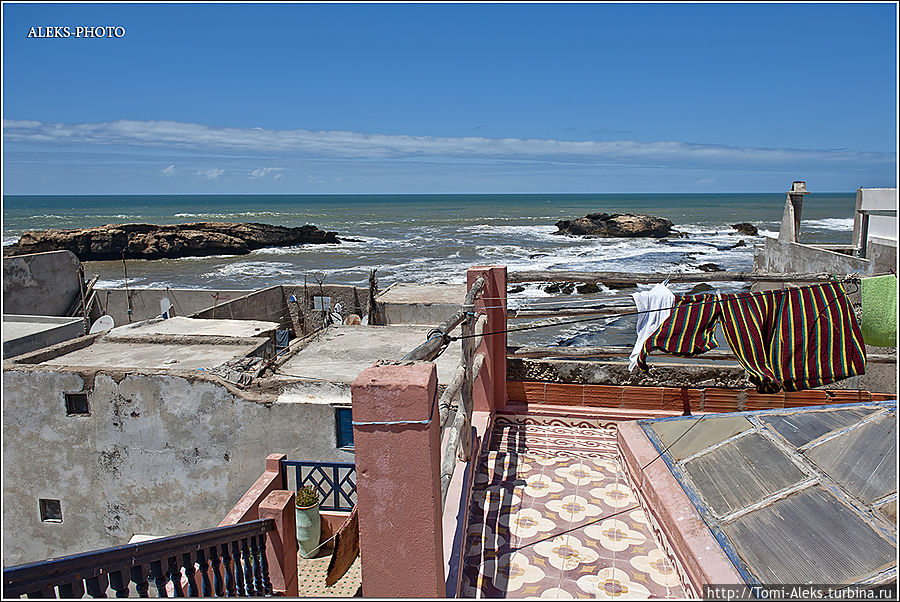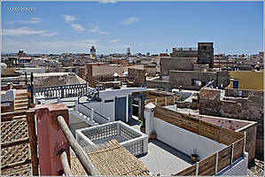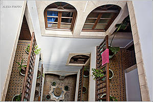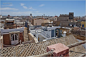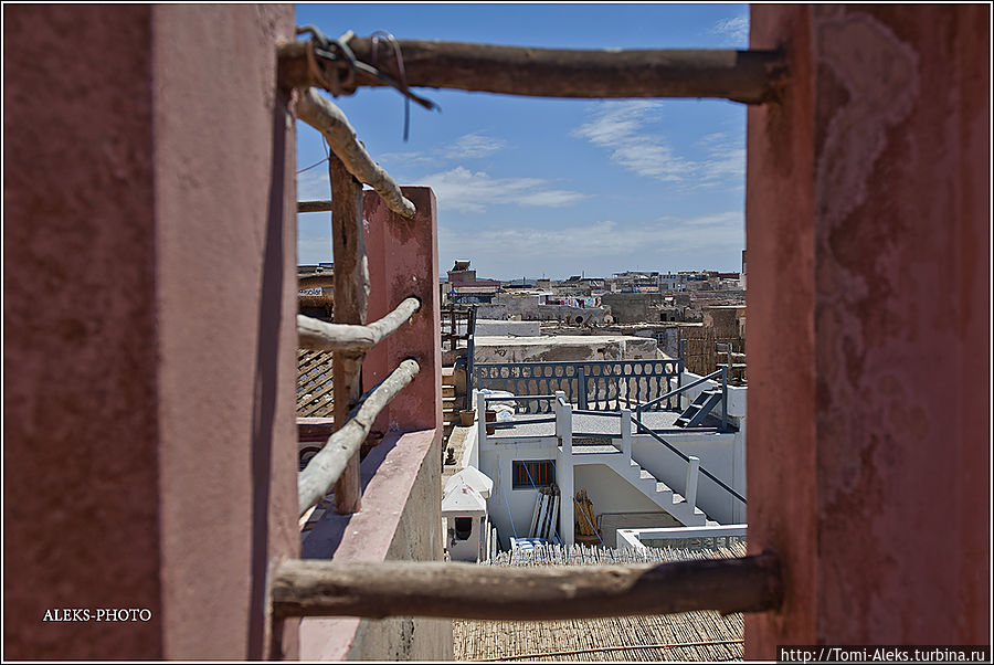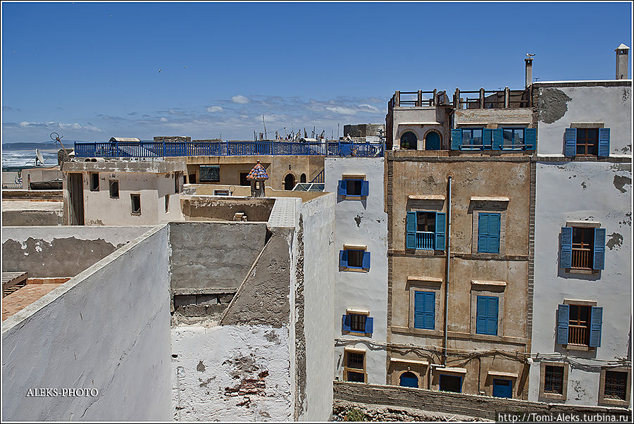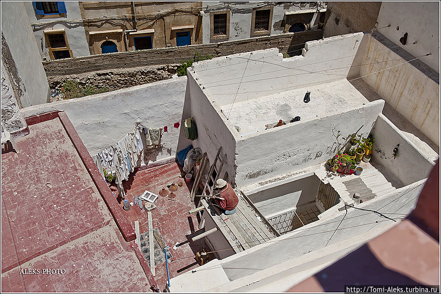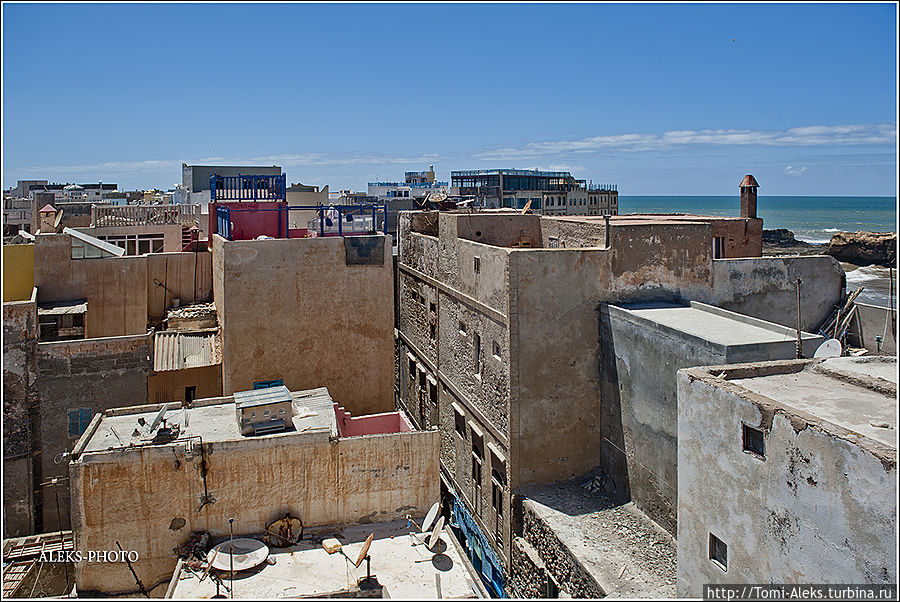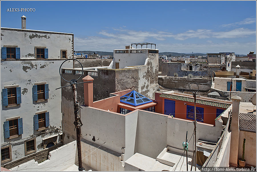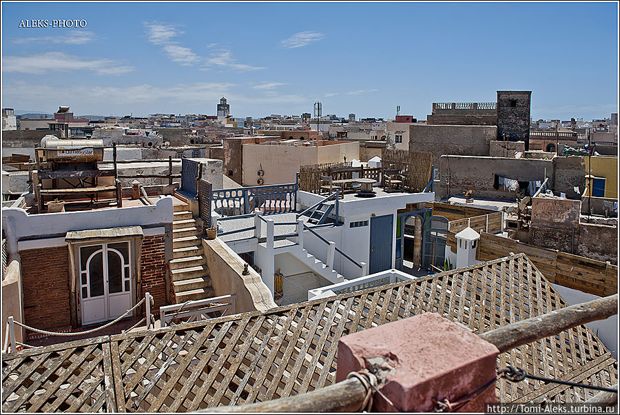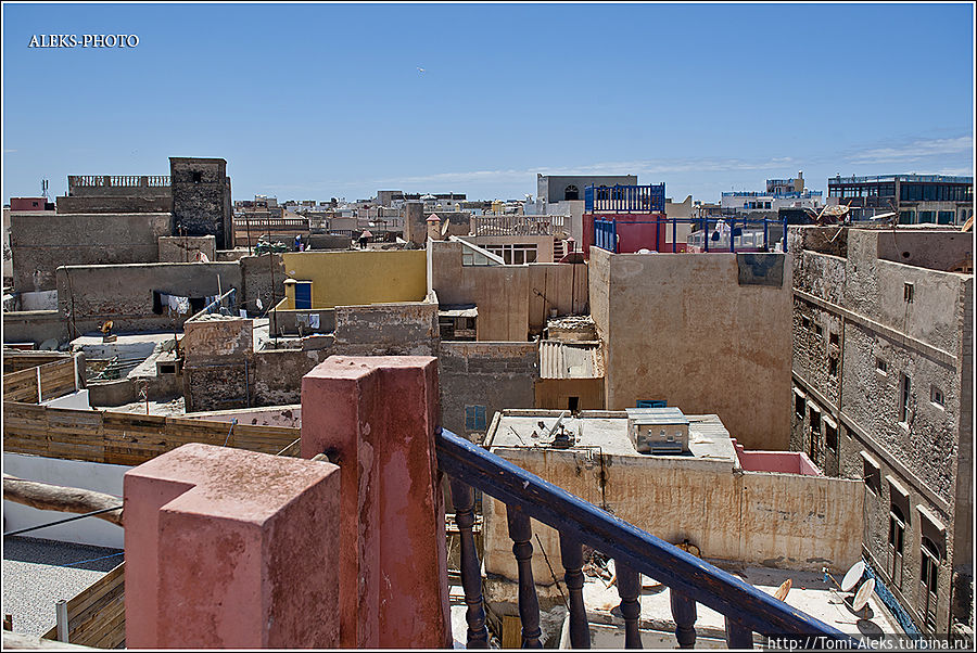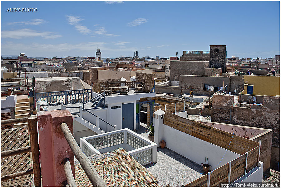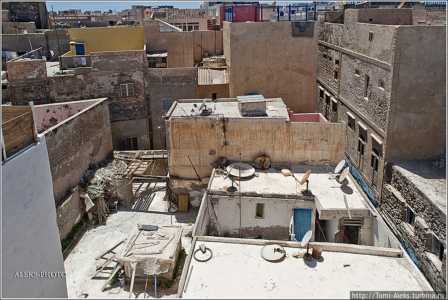 А то, что вашему взору предстает хаос из разновысотных и разноцветных и даже совсем задрыпаных крыш. Часто то там, то тут, из них вырастают к небу башни минаретов. А когда рано утром или вечером начинается вой муэдзинов, сливающийся в какафонию, у вас начинают мурашки по телу бегать. Но зато — экзотика полная. Короче, логике подобное явление не поддается. У марокканцев — своя эстетика. Они любят на крышах проводить время, например, здесь всегда сушат белье. А туристы любят здесь загорать, лежа на каких-нибудь лежаках. Короче, приходит на ум лишь мысль, а почему бы нечто подобное не сделать у нас? Ведь столько тысяч метров полезной площади пропадает... Эх, непрактичные мы, надо учиться у африканцев их африканской геометрии!