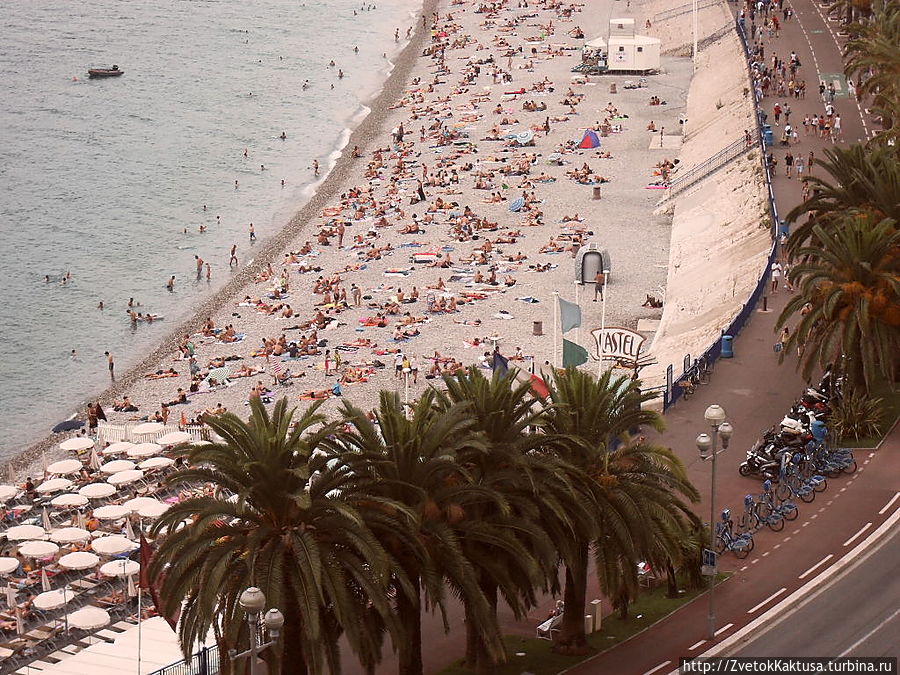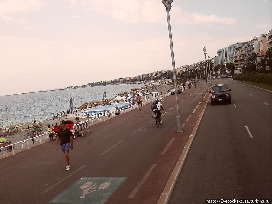 Пляжи Ниццы — это широкая многокилометровая прибрежная полоса за прекрасным шоссе (для всех видов передвижения), но значительно ниже уровня этого шоссе (в Каннах такого понижения нет).