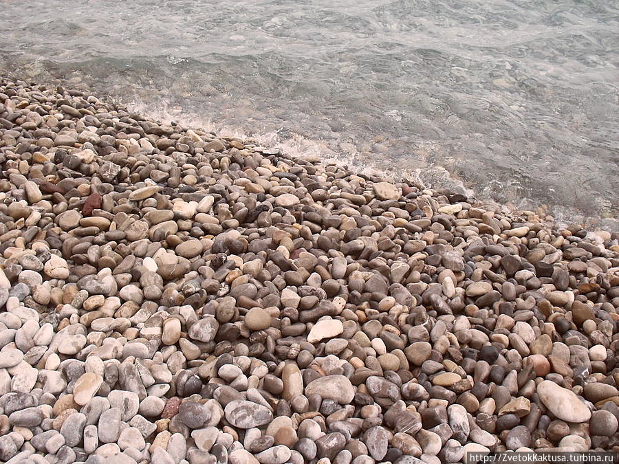 Выбрав наконец-то для себя подходящий пляж, я спустилась по лестницам вниз... и вот тут-то испытала ... самый настоящий шок (может, это я просто такая сверхчувствительная?). Галька...? Нет, сказать что на пляжах Ниццы — галька, это не сказать ВООБЩЕ НИЧЕГО! НАШУ гальку, насколько я помню по Крыму и Кавказу, легко мог зажать в ладошке даже ребёнок! Тамошняя же — это орудие пролетариата и ядра для метательных машин раннего Средневековья. Клянусь! На моих фото пляжа с птичьего полёта (я не летала, а просто взошла на труднодоступную смотровую плошаду :-))) это видно: эффект фактуры "вспененной" фотоплёнки, величина этих булыжников просмотривается достаточно явно.