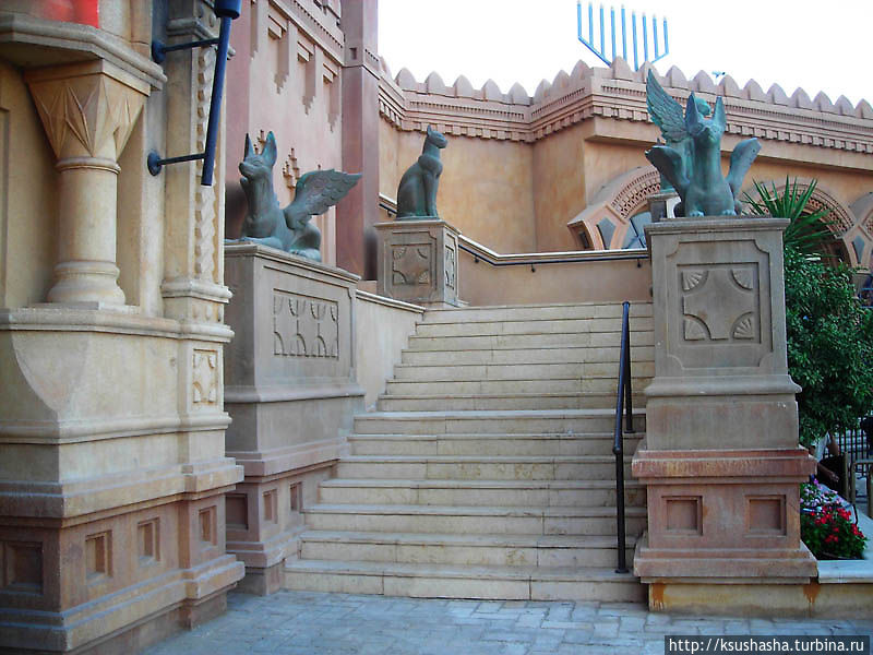 После горбатого мостика толпа станет меньше, а гостиницы роскошнее. Стоит пройтись до самого конца набережной и полюбоваться архитектурой прибрежных дорогих отелей. *Совет №6* Если в какой-то вечер вы решили пойти в кинотеатр "Аймекс" и посмотреть трёхмерный фильм — обязательно берите с собой фотоаппарат! В холле кинотеатра вот уже несколько лет действует экспозиция восковых фигур. Очень интересная тематика — люди, прославившиеся различными отклонениями от обычной внешности. Еще немного знаменитостей и кино-персонажей. *Совет№7* В Эйлате есть сказочный дворец-аттракцион под названием "Город Царей". Если вы с детьми — его не миновать. Но я лично знакома со многими взрослыми и даже солидного возраста людьми, которым очень понравились развлечения, предлагаемые в этом дворце. Фотоаппарат, само-собой — обязательно!