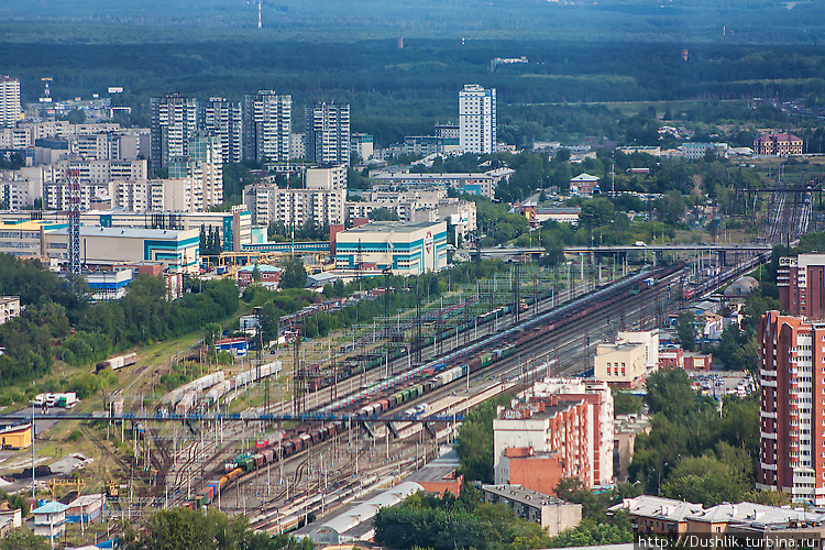 Плавно переходим в восточную часть смотровой площадки. Вдали видны железнодорожные пути и составы на них.