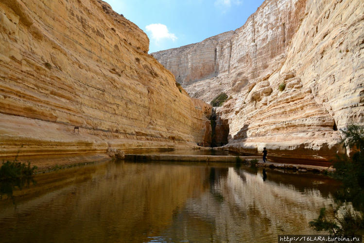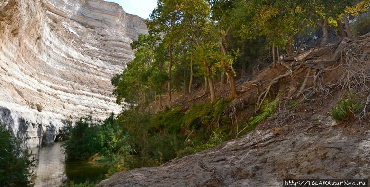 Каньон настоящий, а вот заводь рукотворна, поперечная бетонада и создает это удлиненное озерцо. Не забываем, что находимся в пустыне, естественные водные источники здесь чрезвычайно редки и поэтому так радует вода. Здесь много зелени, на воле живут почти ручные горные козлы, а в воде раки.
