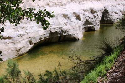 Небольшой водопад ручья Эйн Авдат очень популярен, потому, что тут есть вода круглый год, что редкость в наших краях. Когда-то тут даже купались. А сейчас здесь заповедник. Купаться – нельзя. Кушать и пить – ничего кроме воды. И не шуметь, чтобы не распугать орлов.