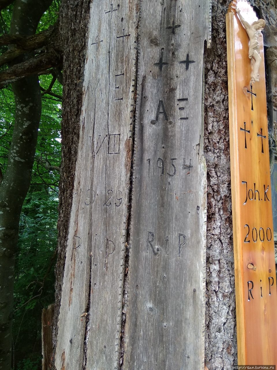С другой стороны деревни недалеко от трассы я заметила странное дерево. Оно было все покрыто старыми и не очень деревянными табличками с крестами, именами и датами. Рядом висело пояснение на немецком. Дома я его перевела.