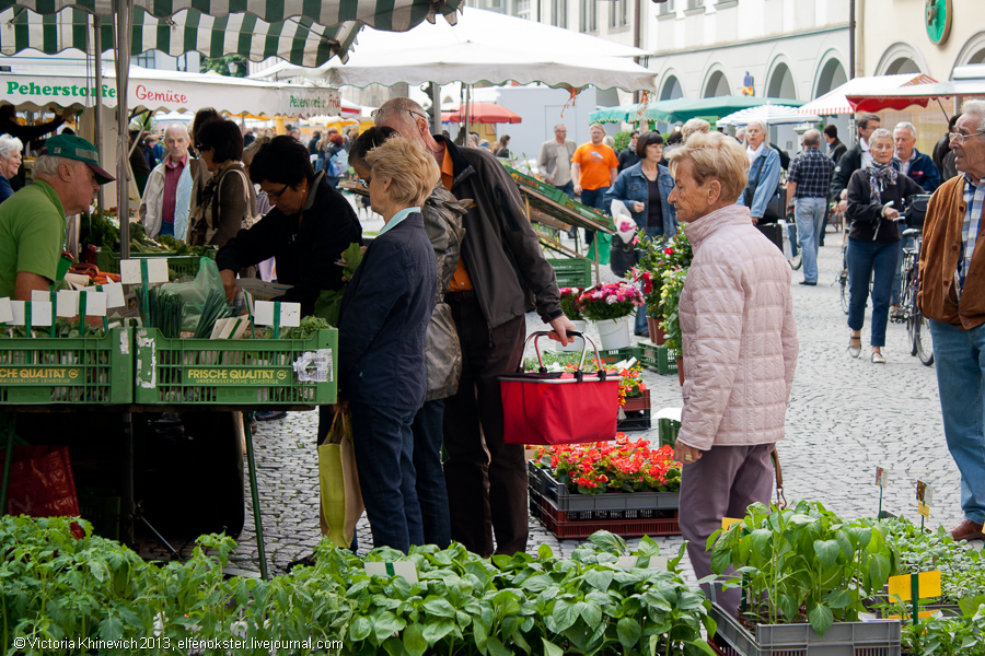 Вот и мы движемся дальше и понимаем, что сегодня самое интересное не на этническом рынке, а вот здесь в рыночном переулке (нем. Marktgasse). Здесь, кажется, продают все: мясо и колбасы, зелень, овощи и фрукты, мед, всякие безделушки. А еще продают цветы, невероятное количество цветов по смешным ценам... Но это буйство красок я вынесла в отдельный альбом