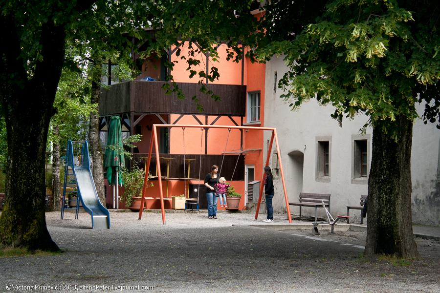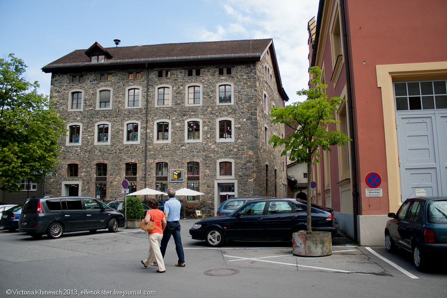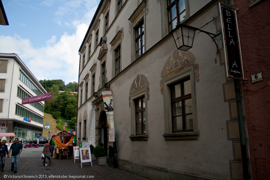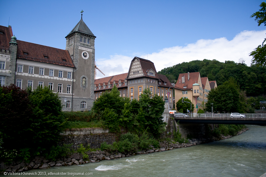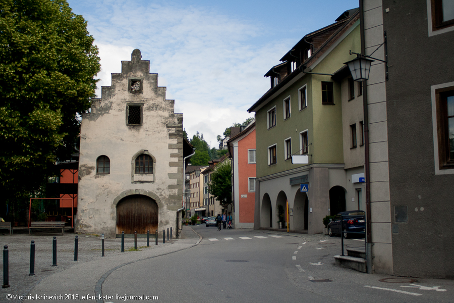 Фельдкирх. Старый замок и Артур Конан Дойль). Пройдемся немного вокруг этого здания (именно около него мы сфотографировали F с заглавной фото), и отправимся дальше, мимо домиков у реки, владельцам которых мы немного завидовали, интересного фонтана и странной скульптуры.