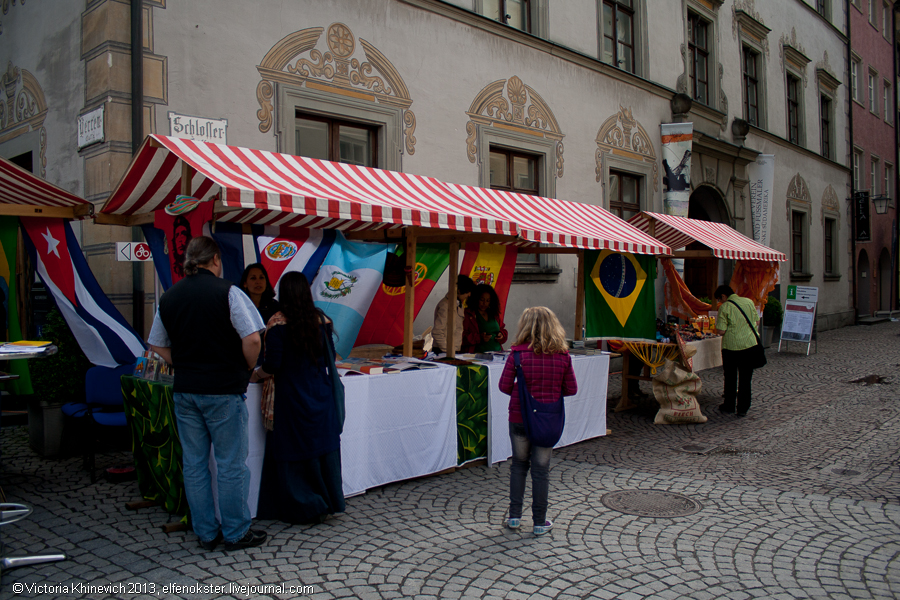 Спустившись с холма, где расположен замок Schattenburg, движемся тихой мощеной улочкой, куда глаза глядят. Неожиданно, но весьма удачно, набредаем на этнический рынок. Здесь собраны флаги, наверное, с доброй половины мира. Хотя у местных почему-то ажиотажа эта торговля не вызывает. Да и ассортимент не очень-то и богатый: в основном продают безделушки и амулеты. Такие вещи хорошо привезти из собственной поездки, а не покупать у заезжего продавца.