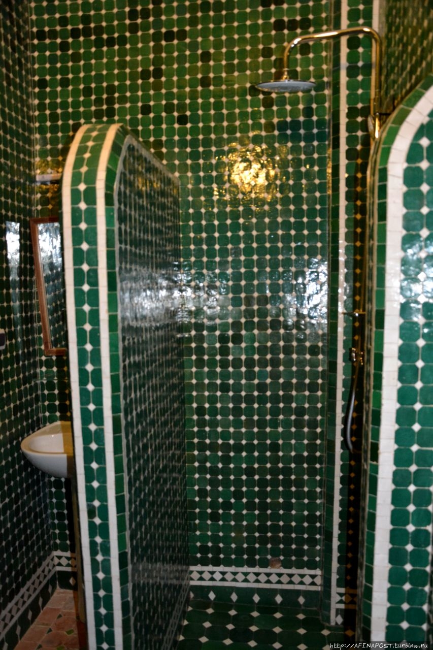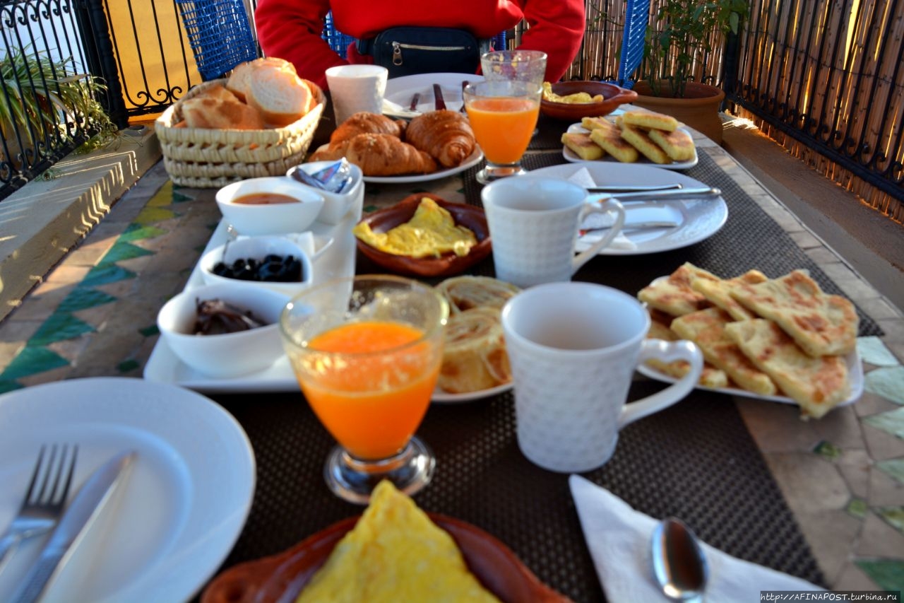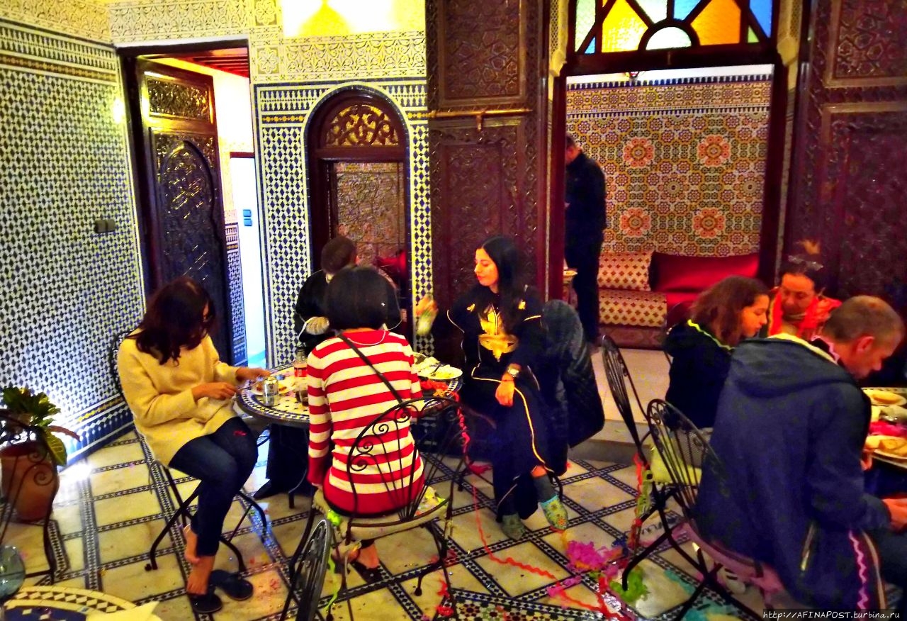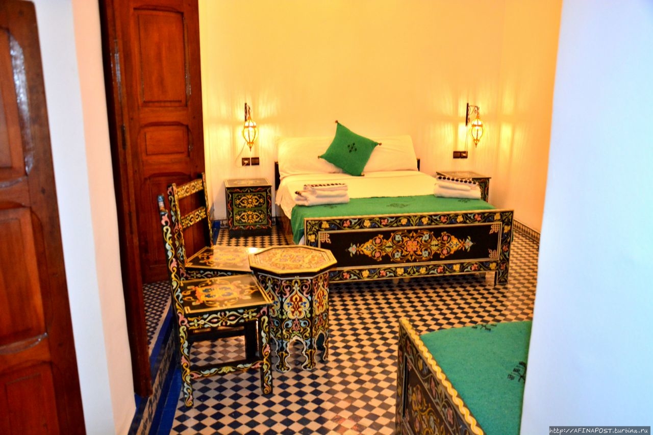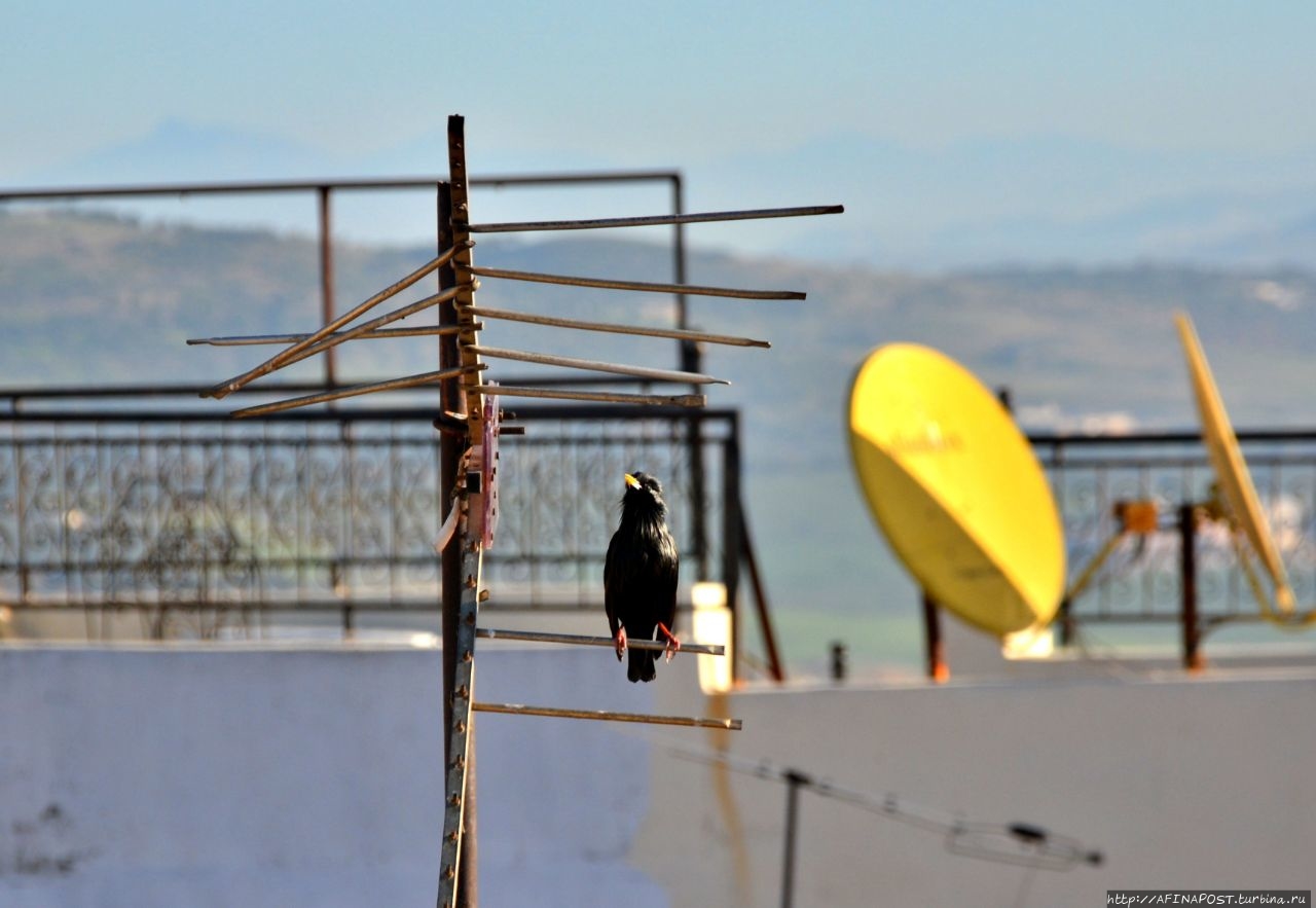 Наш 3-х местный номер оказался удобным и приятным. За трое суток, вместе с налогом, мы заплатили около 153 евро. Завтрак нам накрывали на верхней веранде, и мы могли любоваться с высоты крышами и верандами соседних дворов, украшенным фресками минаретом медресе и на высоком холме древними полуразрушенными арками усыпальницы Меринидов. Каждое утро нас приветствовал своей песенкой скворец.
