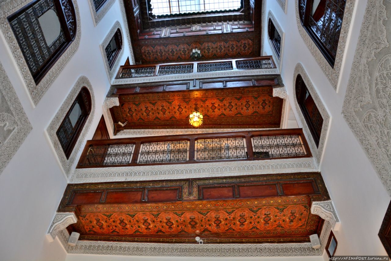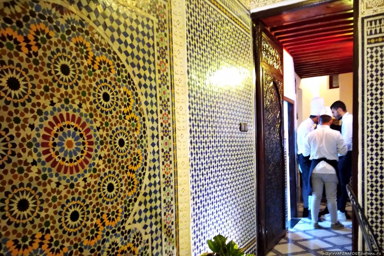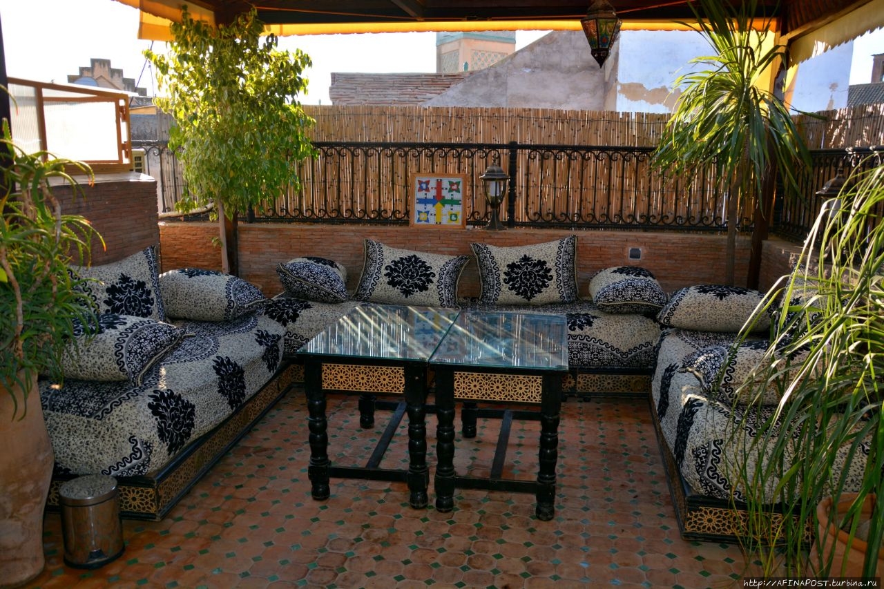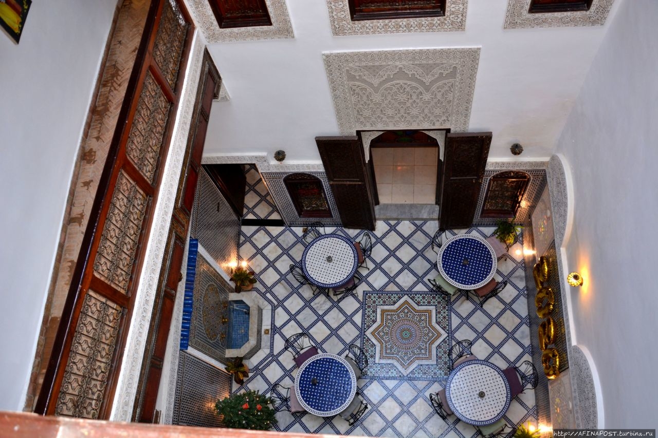 Мы знали, что Марокко — страна, где фантазии становятся реальностью, и вот, жребий выбранного в зимней Москве марокканского отеля в Фесе, привёл нас к неприметной двери в высокой стене узкого переулочка. За порогом этой двери перед нами предстал самый настоящий сказочный мини-дворец с маленьким садом, фонтаном, крошечным внутренним двором, куда выходят все окна номеров и узенькой лестницей ведущей на крышу или можно сказать — смотровую площадку.