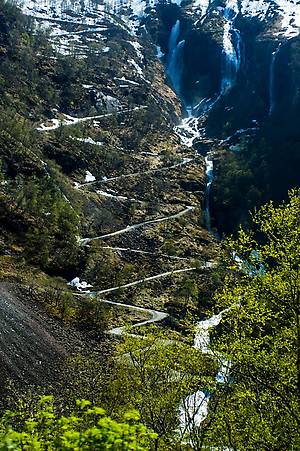 Флом. Маленький уютный Флом. Когда я искал в интернете достопримечательности Норвегии, именно Флом со своей уникальной железной дорогой был в первых рядах. Флом — туристическая деревушка, расположенная на южном берегу, пожалуй самого красивого фьорда Норвегии — Аурландсфьорда. Самой же главной достопримечательностью Флома, как я уже говорил, является Фломская железная дорога, или Фломсбана. Фломсбана имеет длину всего в 20 км, но при этом перепад высот ветки составляет 863 метра, т.е. каждый километр дорога поднимается на 40 метров (каждые 20 метров поднимается на 1 метр). Чем выше поднимаешься, чем чаще высокие раскидистые деревья сменяются на более низкие, прижатые к земле, а зеленые луга сменяются снежными полями.