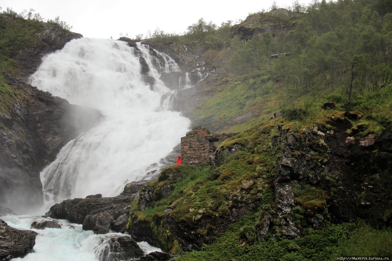 Пройдя через туннель Бакли поезд делает небольшую остановку на высоте 669 метров над уровнем моря. Выходим из вагонов на смотровую площадку у водопада Кьусфоссен. Это один из самых известных водопадов Норвегии. Шум воды, дикая природа гор и красота — всё это волнует и завораживает. Настоящее чудо природы!