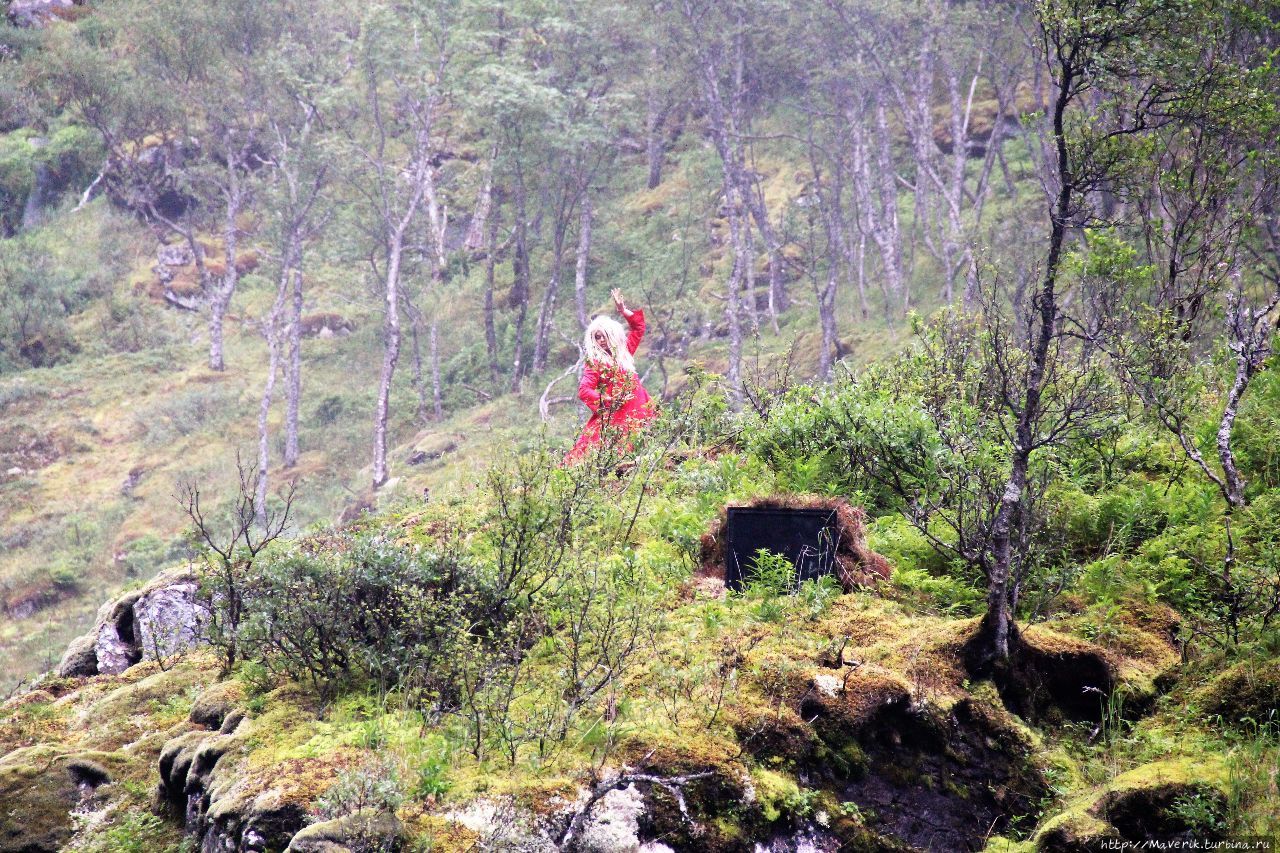Перед нами устраивают небольшое шоу. Внезапно начинает играть музыка, а из-за камней появляется лесная нимфа Хульдра. Согласно норвежской легенде у Хульдры должен быть хвост, кривая спина и очень красивое лицо. Все мужчины влюбляются в её красоту и предлагают ей руку и своё сердце. Хульдра танцует соблазнительный танец. Сразу вспоминается наш добрый советский фильм Леонида Гайдая "Бриллиантовая рука" — "Руссо туристо облико морале"! После фотосессии все садимся в поезд и продолжаем движение. Поезд следует сквозь извилистый туннель который внутри горы поворачивается на 180 градусов. В районе станции Кордал нашему взору открывается головокружительный вид. Мы видим серпантин дороги поднимающийся на крутую гору Мирдалсберге, состоящий из 21 поворота. Водопад Кордалсфоссен низвергается рядом. А самое интересное — можно наблюдать сразу три уровня Фломской дороги: по первому уровню наш поезд движется сейчас; второй уровень — где железная дорога проходит по галерее, и третий уровень — на самом верху, где виден красный дом(станция Мюрдал). После подъёма на станцию Мюрдал нам предстоял обратный маршрут в живописный Флом.
