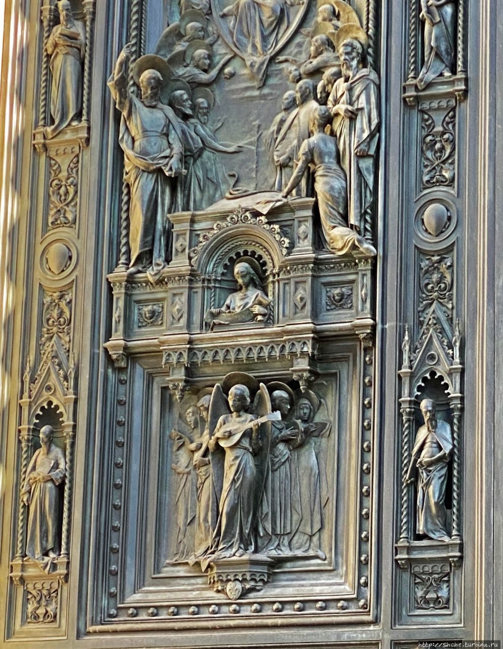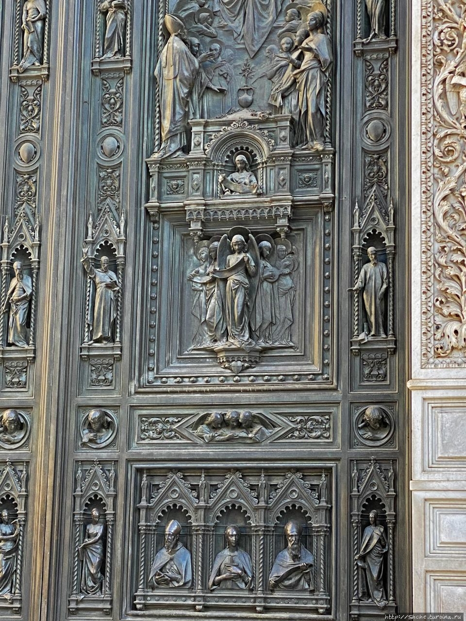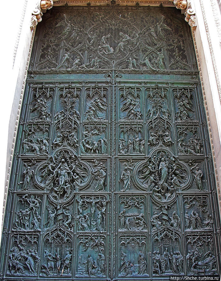 Двери Миланского собора, способные вызвать культурный шок... Зайти внутрь собора можно свободно и бесплатно. Но проходы к алтарю перекрыты ленточками...