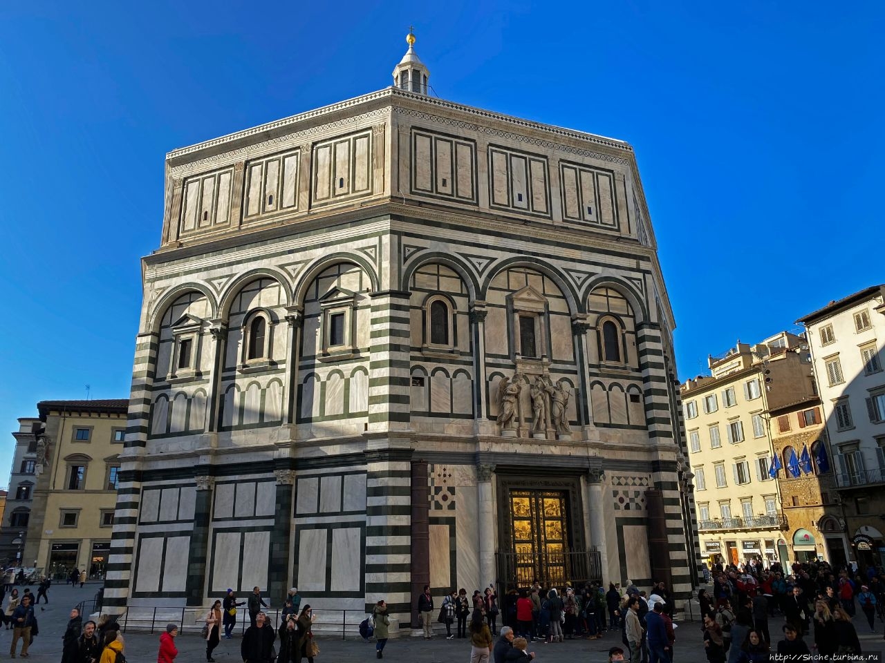 Флорентийский баптистерий, он роскошен внутри... Увы, чтобы попасть в баптистерий (как и в крипту собора и на колокольню) о билетах стоило позаботиться заранее. Но и без этого одна деталь Баптистерия сумела произвести весьма яркое впечатление, причем в прямо и переносном смысле этого слова. Видите на фото толпу возле восточной стороны сооружения? Это многочисленные туристы фотографируются возле позолоченных восточных ворот. Поверьте, нужно запастись изрядным терпением, чтобы улучить момент и сфотографировать эти роскошные двери целиком.