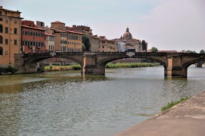 По бокам моста Понте-Веккьо стоят изящный мост Санта-Тринита с одной стороны и мост Понте-алле-Грацие с другой стороны.