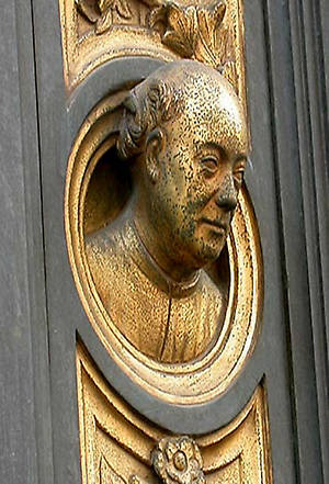 Свое изображение Гиберти поместил на восточных воротах лицом к Собору Дуомо на левой створке дверей.
