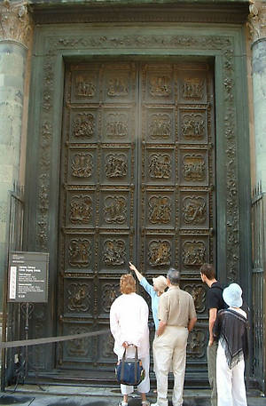 Северные и восточные врата – самые ценные объекты истории современного искусства. Они знаменуют собой ключевой момент развития приемов Ренессанса, таких как естественная перспектива. Северные двери были задуманы городскими властями в эпохальный 1401 год (год, с которого ведется отсчет эпохи Возрождения). В 1402 году богатая флорентийская гильдия торговцев тканями в честь избавления города от чумы объявила конкурс – первый в истории искусств – на создание дверей для Баптистерия. Семи ведущим художникам было предложено сделать панели на одну и ту же тему – житие Христа и евангелистов. Победителями были признаны Лоренцо Гиберти и Филиппо Брунеллески. Судьи конкурса никак не могли выбрать лучшего из них и предложили двум талантам работать над дверьми совместно. Однако Брунеллески обидевшись, ответил отказом и отправился в Рим изучать классическую архитектуру. Интересно, что с тех пор он никогда не занимался скульптурой.