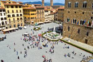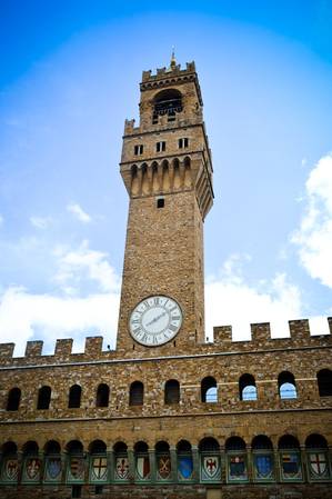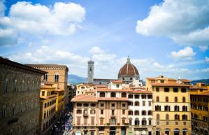 Насмотревшись на величайшие шедевры живописи и скульптуры, коридоры галереи сами вывели нас на террасу, где расположилось кафе. Если после духовной пищи организм требует еды для тела, то здесь можно перекусить. Ценник за два panini и бутылку воды примерно 10-12 €, но место примечательно не этим. С терассы открывается отличный вид на Башню Арнольфо ди Камбио, возвышающуюся над Палаццо Веккьо и купол собора Санта Мария дель Фьоре.