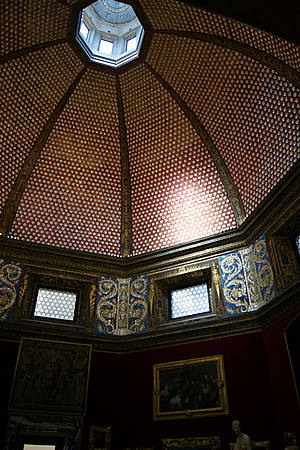 Само помещение символизирует космос, точнее его элементы: фонарь с розой ветров – воздух, раковины – воду, красные стены – огонь, мраморы и драгоценные камни пола – землю.