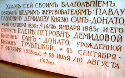 Их пожертвования на строительство церкви во Флоренции были отмечены установкой мраморной мемориальной доски на русском и итальянском языках: «Храм сей своим благолепием обязан Павлу Павловичу, князю Сан-Донато, и его супруге Елене Павловне, урождённой Трубецкой».