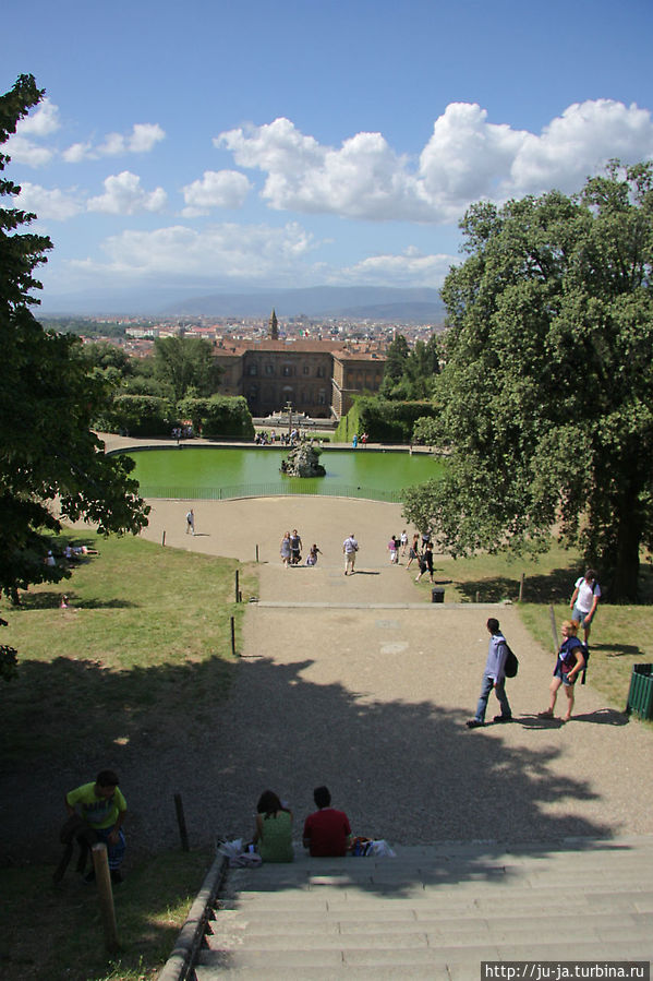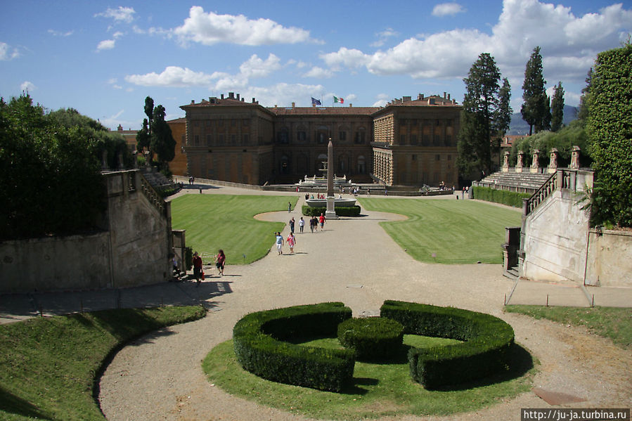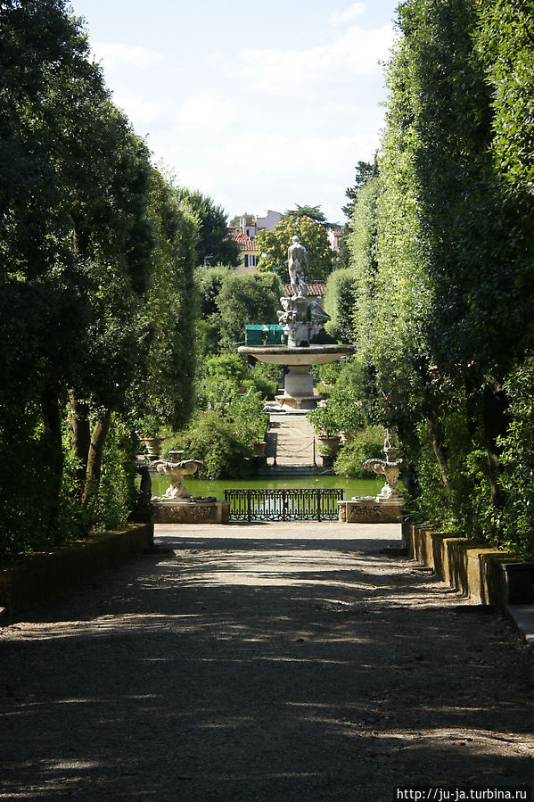 Главная осевая дорожка, ведущая между кипарисами и каменными дубами к тыльному фасаду палаццо Питти, начинается внизу у амфитеатра, напоминающего по своей форме половину классического ипподрома, и поднимается вверх на холм Боболи. В этом амфитеатре проходили самые первые оперные спектакли в мире. В центре амфитеатра находится древнеегипетский обелиск из Луксора, привезённый сюда с римской виллы Медичи. Эту главную дорожку венчают фонтан Нептуна, который флорентийцы шутливо называют фонтаном с вилкой, и скульптура Стольдо Лоренци. Другая осевая дорожка в правом углу от главной дорожки ведёт через целый ряд террас и фонтанов.