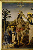 Примечательно, что на этой картине есть один ангел (слева), которого рисовал совсем молодой Леонардо да Винчи, будучи учеником великого мастера.
