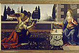 Кроме того, в галерее не могло обойтись и без полотен самого Леонардо да Винчи, в том числе и его самых ранних работ, среди которых особого внимания заслуживает знаменитое «Благовещение», в котором стиль художника только проявляется, но еще находится под влиянием учителя Верроккьо.