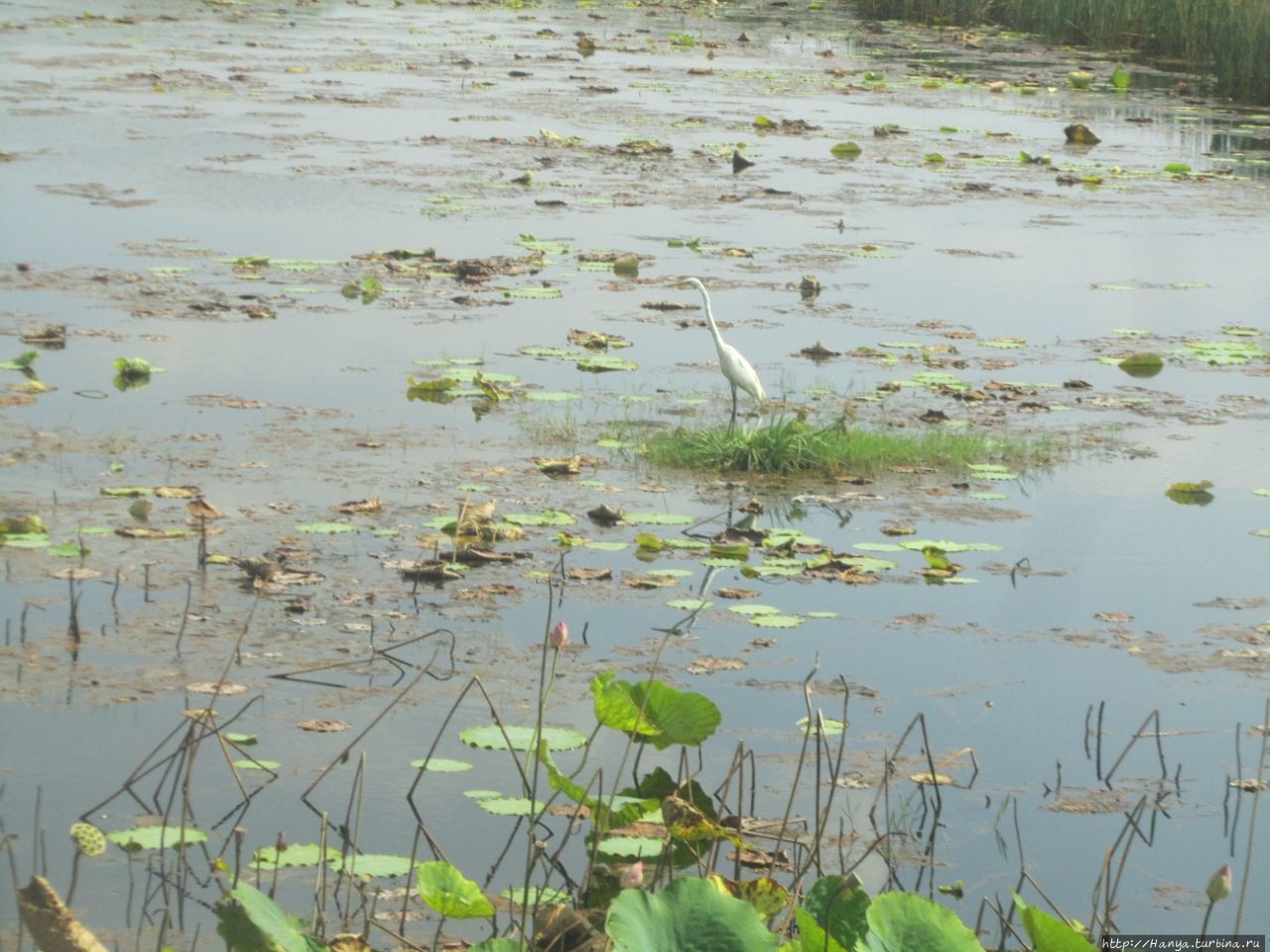 Водитель периодически делает остановки, но двери не открывает. Через окна мы видим, что кое-где цветут лотосы, дополняя нежными красками водную гладь и заглушая скукожившуюся листву.