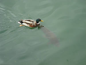 В пруду плавают карпы и утки