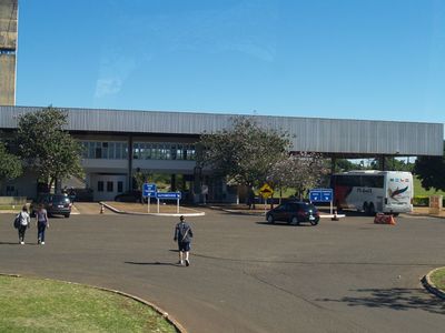 Есть также и несколько дальних международных автобусных линий, связывающих крупнейшие города двух стран, здесь виден один из таких автобусов (бразильской компании PLUMA). Причём этот снимок был сделан мною с борта другого международного автобуса: