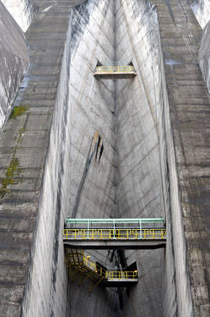 Высота дамбы - почти 200 метров. Чтобы попасть внутрь, надо выполнить кучу идиотских инструкций. Например, у меня потребовали сдать на хранение чехлы от камеры и даже от штатива.
