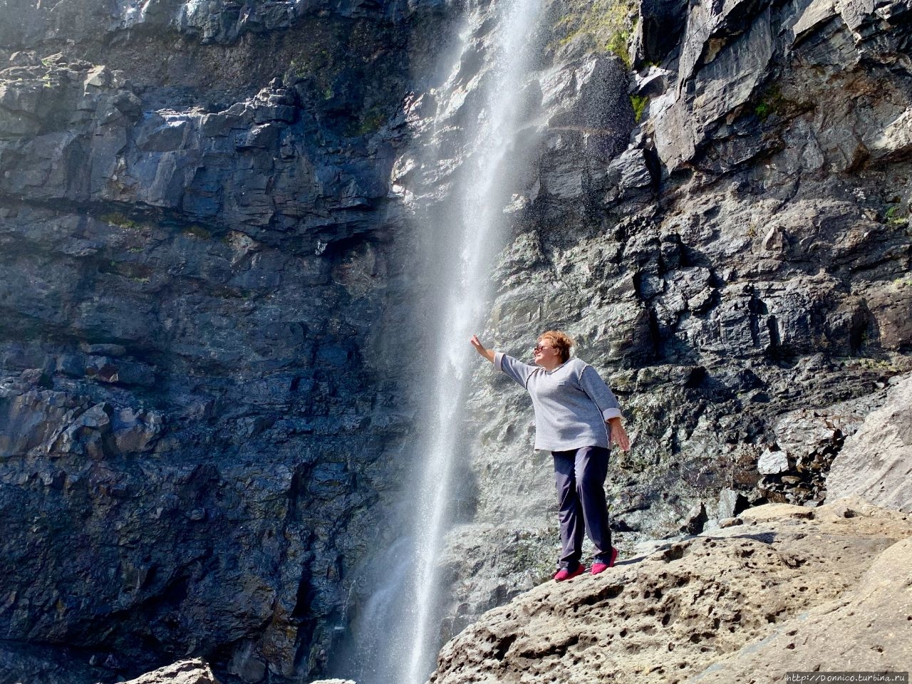 Двойственная сущность водопада, отраженная в его названии, вскрылась буквально у стоящего на обочине дороги плаката, который открыл нам что водопадов на самом деле не один а сразу 2. Один над другим, просто второй, более грандиозный чем первый, можно увидеть только вскарабкавшись на скалу или подняв за ближайший уступ дрон... Что Леша с Романом тут же и сделали.