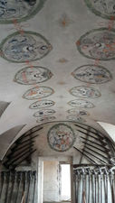 По лестнице поднимаемся к старой части замка, возведенного на базальтовой скале. Маленький двор и вот мы заходим в святая святых этого заведения в старую часть замка. Экскурсия построена таким образом, что переходя из комнаты в комнату посетитель узнает историю замка и его обладателей от первоисточника и до наших дней. Налево от входа герб первых хозяев замка рода Роновцев. В нем две скрещенные ветви.