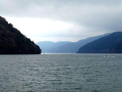 Фото с рекламного буклета.Неподалеку от озера расположено немалое количество реканов, онсенов с горячими источниками, есть знаменитые исторические места. На самом берегу озера, почти в воде стоят ворота Тории и чуть выше храм Хаконе.