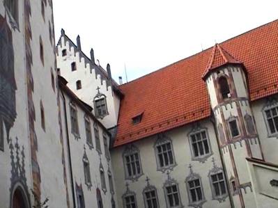 Замок Епископов Фюссена находится на вершине холма Шлоссберг, главенствующего над городом. Поэтому любого туриста, приехавшего сюда, в первую очередь тянет наверх, чтобы увидеть оттуда панораму города, а также посетить замок с его музеями и экспозициями. Это, безусловно, стоит сделать, так как оранжевые черепичные крыши Фюссена на фоне гор произведут на вас самое лучшее впечатление. Да и сам замок, хоть и маленький, но очень живописный. Несколько разочарует, что исполненные в готическом стиле эркеры на стенах замка всего лишь нарисованы. Но, оказывается, этому даже есть название — "росписи-обманки". Не знаю, есть ли в планах местных властей достроить эти эркеры или нет. Так как росписям около трехсот лет, думаю, их так и оставят. Внутри замка привлечет внимание рыцарский зал и коллекция живописи.
