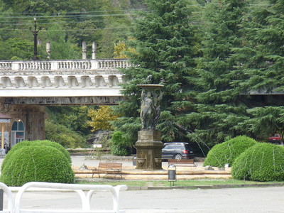 Вообще мы в Гаграх уже были (но тогда мы жили в Сухуми и в один из дней поехали посмотреть Гагры, Пицунду, крепость, скальный монастырь и форелевое хозяйство — sarycheva-s.livejournal.com ). В прошлый раз с водителем-гидом мы начали наш обзор города с колоннады. Однако если вы, как и мы в этот раз, поедете сами по себе, советую начать прогулку с автовокзала и железнодорожной станции с фонтаном.